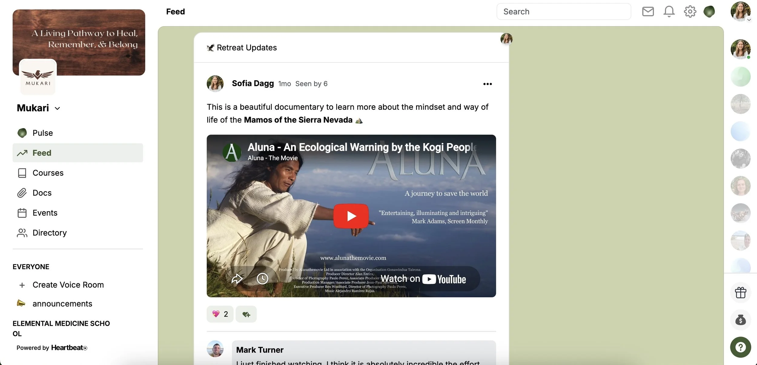 Focused Conversations: Unlike messy "group chats" on other apps, Heartbeat uses organized threads. We have specific channels for retreat support, plant medicine remedy questions, and elemental reflections.